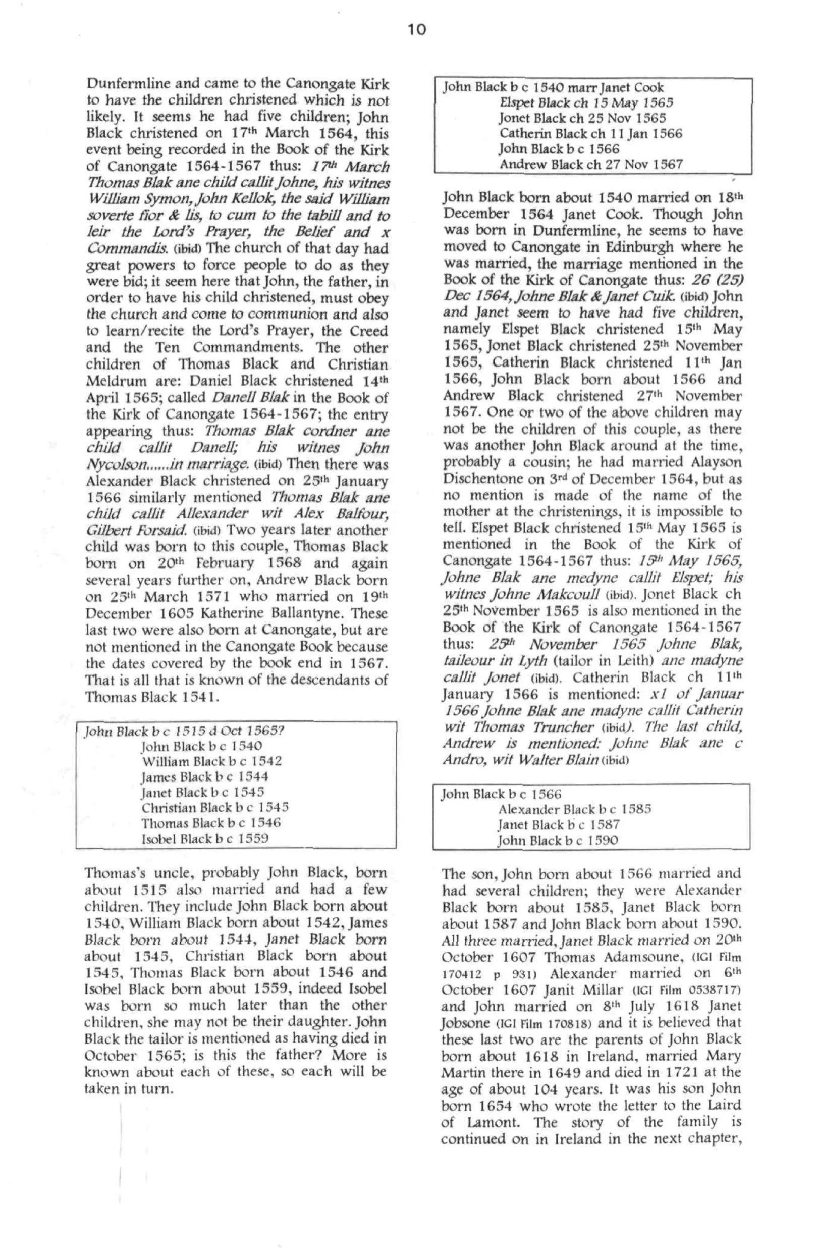 Following is a page from “A clerical tradition” where I read the author believes the John Black b 1590 in Canongate is the father of John Black b 1620 in Broughshane, County Antrim, Ireland.