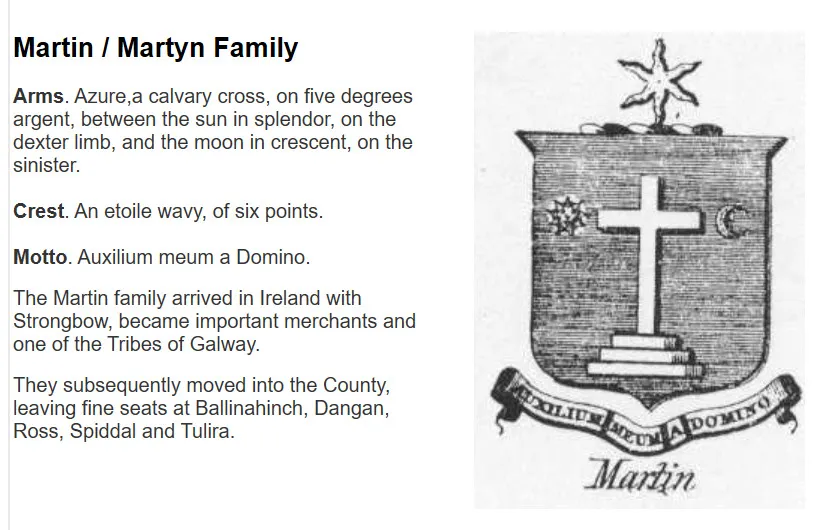 The Martin family is of early origin in Galway. Their pedigree relates, that Oliver Martin was the first of the name, that settled in Ireland. He that he was a follower of Strongbow, and the name Martin was derived from Martius, warlike.