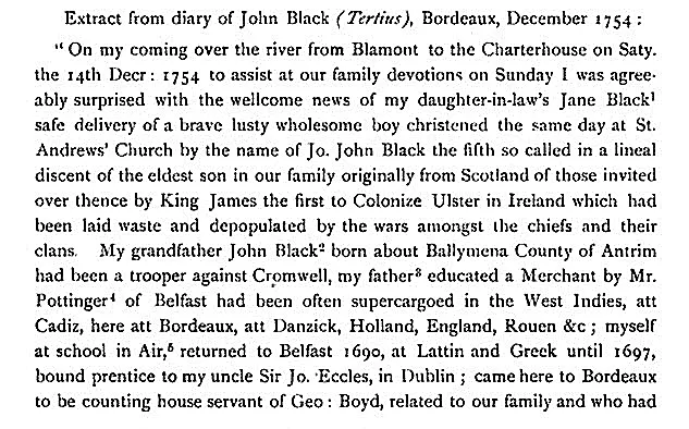 John Black (Tertius) states in his notes of 1754 on a family visit he was pleasantly welcomed by the news of his daughter- in- law Jane Bank’s safe delivery of a baby boy by the name of “John Black the fifth so called in a lineal descent of the eldest son in our family originally from Scotland.”