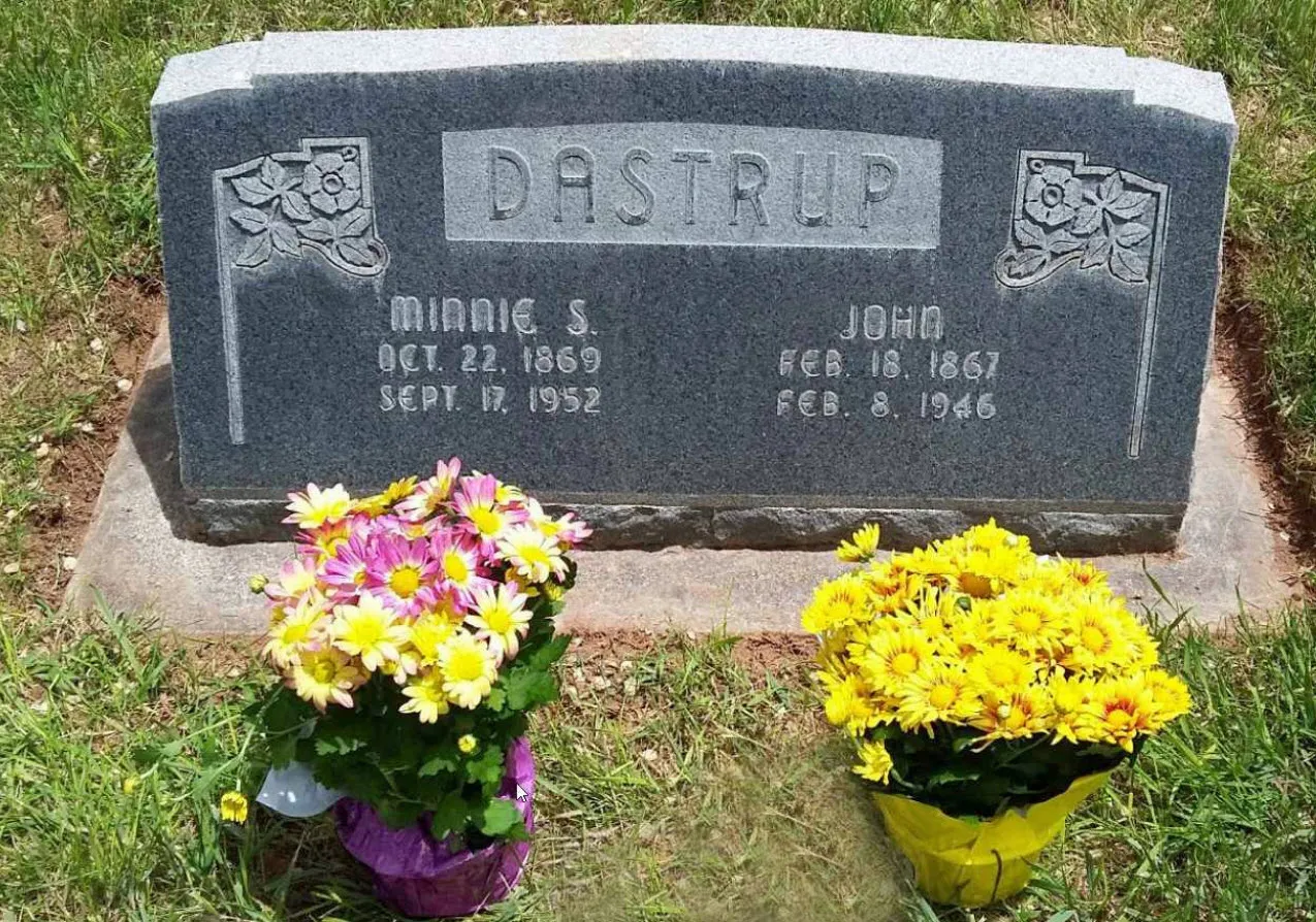 John Dastrup was born on 18 Feb 1867 in Moroni, Sanpete, Utah. He died on 8 Feb 1946 in Richfield, Sevier, Utah. He was buried on 12 Feb 1946 in Richfield City Cemetery, Richfield, Sevier, Utah. He Married Minnie Snow, daughter of Bernard Snow and Sarah Gledhill on 20 Feb 1889 in Manti, Sanpete, Utah, Minnie was born on 22 Oct 1869 in Springville, Utah, Utah and died on 17 Sep 1952 in Richfield, Sevier, Utah. She was buried on 20 Sep 1952 in Richfield City Cemetery, Richfield, Sevier, Utah.