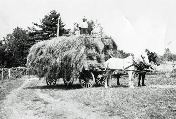 In the early days all farm equipment was operated solely by horse power. These horses were kept at Uncle Harvey’s house, which was just through the field from our house. In the summer my day would start by walking through the field and watching Grandpa and Uncle Harvey harness the horses and hook them up to the wagon we were going to use that day. I so enjoyed jumping on the wagon and riding about a mile up the road to where the major crops were. I was also glad when the day was over and we headed back to Uncle Harvey’s house. I was amazed at how hard these horses worked and how they acted when they had their harnesses taken off and released to go to the pasture which was next to where we lived.